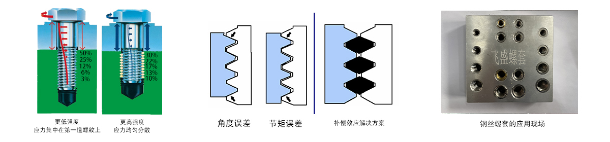 2、因鋼絲螺套有一定彈性,可使螺紋各圈上的負載分布比較均勻,消除螺釘與螺孔之間的螺距和牙型偏差,并能吸收振動,因而提高了螺紋的連接強度和耐疲勞強度。